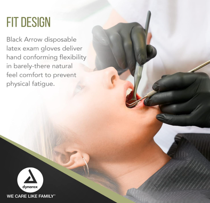 Dynarex Black Arrow Latex Exam Gloves are high-quality, polymer-lined gloves designed for enhanced protection and performance. These ambidextrous, powder-free Gloves feature a minimum thickness of 6 mil at the palm and 7 mil at the fingertips for tactile sensitivity, textured palms for increased grip, and beaded cuffs to allow for easy donning.