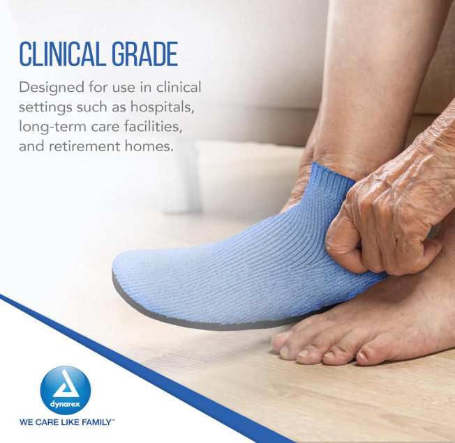 Dynarex Hard Sole Slipper Socks feature anti-skid rubber grips to help prevent patient falls. The Slipper Socks are made from soft terrycloth fabric to keep feet warm, dry, and comfortable. Designed for use in clinical settings such as hospitals, long-term care facilities, and retirement homes.