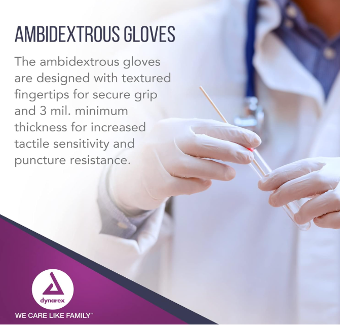 - Minimum thickness of 3 mil at fingertips and palm for increased tactile sensitivity