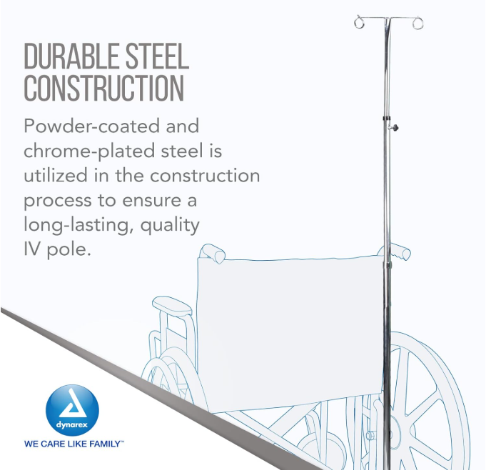 - The Dynarex Universal Telescoping Wheelchair IV Pole is height adjustable and features dual loops to accommodate two IV bags.
