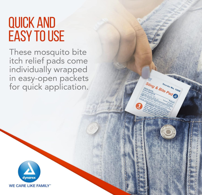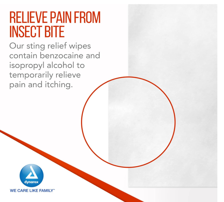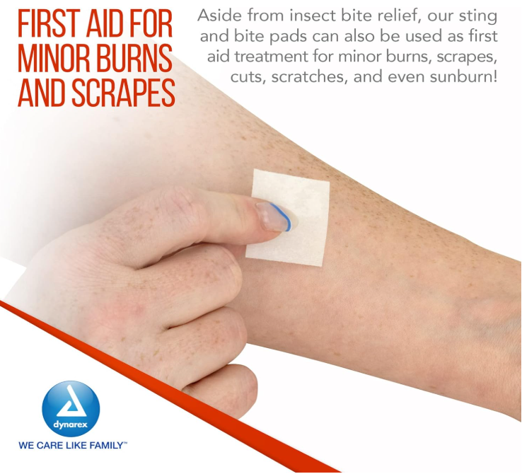 Dynarex DynaSafety Sting & Bite Pads are premium-quality wipes designed to temporarily relieve pain and irritation associated with insect stings and bites. These Bite Pads are packed in easy-to-open packets for quick access, and feature a compact size for convenient storage and portability in travel bags, first-aid kits, and backpacks.